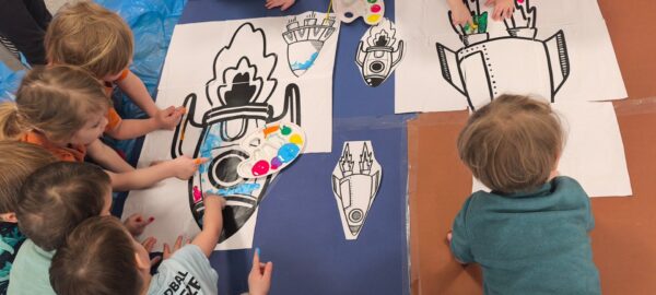 Nasze przedszkolaki stworzyły własne, wyjątkowe rakiety! 🚀 Każde dziecko miało swój wkład w ich powstanie – malowało i kolorowało fragment, dzięki czemu powstały kolorowe, niepowtarzalne prace. Rakiety są gotowe do startu, a dzieci z radością tworzyły i rozwijały swoją wyobraźnię podczas wspólnej zabawy 🌌✨To była wspaniała lekcja współpracy i kreatywnej zabawy 😊Brawo dla naszych małych astronautów! 👩🚀👨🚀